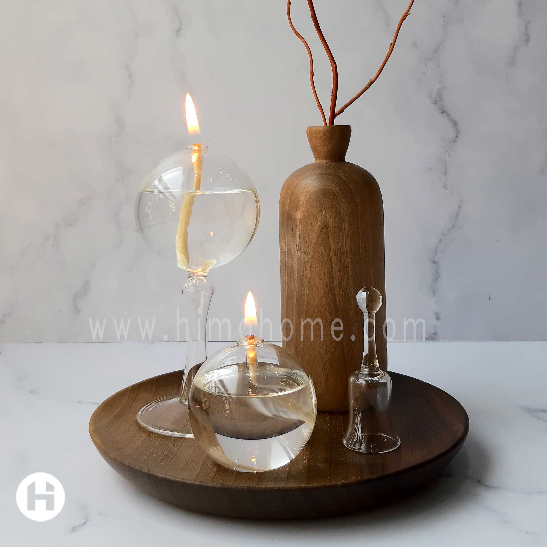 سینی چوبی قطر 20 سانت، گلدان چوبی ارتفاع 16 سانت، شمع پیرکس حبابی پایه‌دار قطر 7 و ارتفاع 16 سانت، شمع پیرکس حبابی با قطر 7 سانت